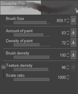 There's 2 brushes in the pack, one for big areas (the thin gouache) and one for details, (the thick gouache) Make sure to keep the texture sizes the same or it will look wonky. Texture density is yours to play with.