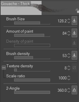 The texture angle must also stay the same between the two brushes, but the 2-angle option on the thick gouache allows you to change the bristle density, a little goes a long way.